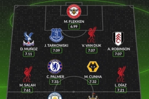 中场:萨拉赫(利物浦)、帕尔默(切尔西)、库尼亚(狼队)、迪亚斯(利物浦)