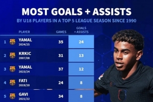 体育资讯5月27日讯 德国转会市场统计了1990年以来五大联赛U18球员单赛季参与进球的数量,并列出榜单,本赛季亚马尔参与24球居首,前3名独占2席。