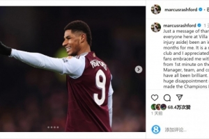 拉什福德本赛季后半段被曼联外租至维拉,他的租借即将到期,拉什福德社媒晒出身穿维拉球衣的照片,并写道:“只是想对维拉的每一个人说声谢谢,这几个月(除了受伤)对我来说是不可思议的。”