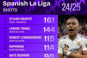 体育资讯5月28日讯 Squawka统计了本赛季球员在西甲的射门次数,姆巴佩161次射门居首,2016-2017赛季以来,他是第三位西甲单赛季射门150+的球员,前两位是C罗和梅西。