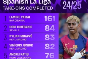 体育资讯5月28日讯 Squawka统计了球员本赛季在西甲的成功过人次数,并列出榜单,亚马尔161次断层居首。2016-2017赛季以来,仅梅西(185、182)、内马尔(168)西甲单赛季成功过人次数多于亚马尔。