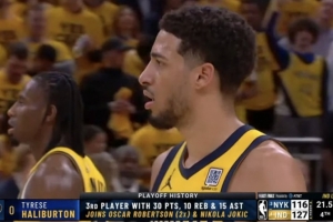 据统计,哈利伯顿成为季后赛历史上第三位砍下至少30分10板15助攻的球员,比肩大O(2次)、约基奇。