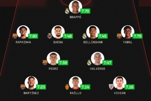 体育资讯5月28日讯 Sofascore评出了本赛季西甲最佳阵容,亚马尔、姆巴佩、拉菲尼亚、佩德里、贝林厄姆在列。