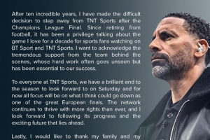 致TNT体育的所有人,我们将在周六迎来本赛季精彩的收官之战,现在所有的焦点都将放在我认为可能成为欧洲最伟大决赛之一的比赛上,TNT体育网络拥有比以往更多的版权,持续蓬勃成长,我期待关注它的发展和激动人心的未来。