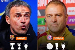 恩里克在14-15赛季带领巴萨赢得三冠王,弗里克在19-20赛季带领拜仁赢得三冠王。
