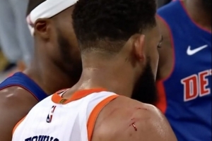 美网友晒出一张照片,唐斯在比赛中肩膀上出现了多道血痕,鲜血从伤口渗出。