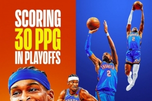 亚历山大今年季后赛场均29.8分5.7篮板6.9助攻1.6抢断,三分命中率30%