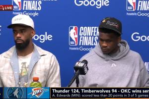 赛后,爱德华兹被问到连续两年倒在西部决赛是否难受。对此,爱德华兹表示:“其实我很兴奋,我才23岁,比起自己,我更为康利(即将38岁)感到难过。我们去年没做到,今年也没做到,明年继续努力就是了。难受是一个很糟糕的词,应该说我很兴奋。今年夏天我会练得比任何人都狠,明年为康利再冲一次!”
