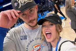 卡鲁索的妻子Haleigh Broucher晒出了两人在赛场的甜蜜合照,并喊话:“再来四场胜利。”