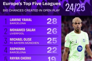 体育资讯5月29日讯 Squawka统计了本赛季球员在五大联赛运动战中创造重大机会的次数,并列出榜单,亚马尔28次居首,萨拉赫、奥利塞二三位。