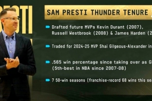 体育资讯5月30日讯 美媒ClutchPoints列出了萨姆-普雷斯蒂作为雷霆GM以来的主要履历: