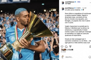 体育资讯5月31日讯 那不勒斯官方宣布与33岁后卫胡安-热苏斯续约至2026年。胡安-热苏斯更新社媒表达了对俱乐部的热爱和续约的喜悦。
