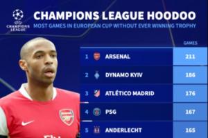 德转统计参加欧冠比赛却未夺冠的俱乐部中,阿森纳211场仍未夺冠排名第一,而即将要冲击首冠的巴黎,以167场仍未夺冠排名第4。
