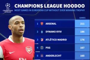 体育资讯04月30日讯 德转在凌晨欧冠赛前统计了历史上参加欧冠场次最多、但至今未夺冠的球队排名。阿森纳211场(未算凌晨比赛)历史第一、马竞176场第3、巴黎167场第4。