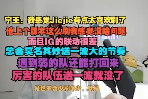 Ning王解说:我感觉Jiejie有点太喜欢刷了,他上个版本这么刷我感觉没啥问题,而且IG的联动很差,总会莫名其妙送一波大的节奏,遇到弱的队还能打回。