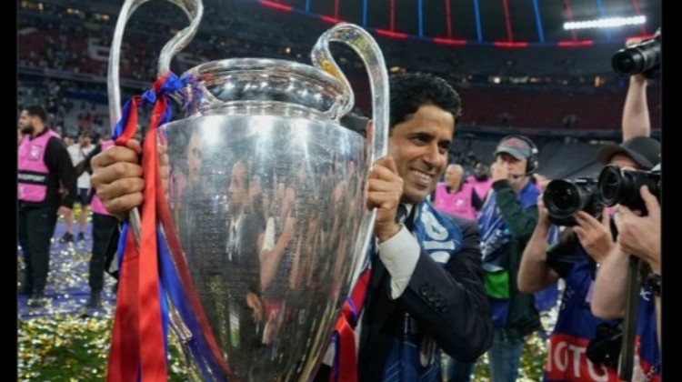 赛后,巴黎圣日耳曼主席纳赛尔身披球队围巾,开心地捧起欧冠奖杯。