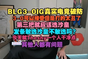 赛后B站up“真实电竞”发布视频锐评:BLG3-0IG破防,3-0可以接受但是打的太丑了,第三把就应该选沙皇,发条敢选沙皇不敢选吗?今天就Theshy一个人干净点,其他人都有问题。