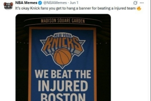 旗帜上印着尼克斯队徽,并写着:我们在季后赛次轮击败了(主将)受伤的凯尔特人。