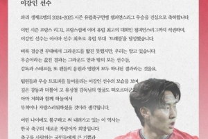 尽管本场比赛李刚仁没出场,但他还是收获了自己巴黎生涯的第7个冠军奖杯,个人生涯已夺8冠。韩国足协官推今日晒出了该协会给李刚仁的贺信,内容如下: