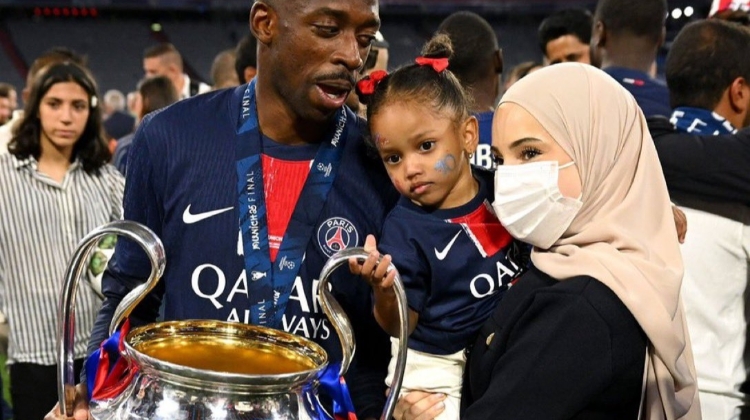 赛后,登贝莱与妻子女儿一起捧大耳朵杯庆祝。