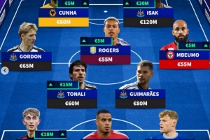 中场:戈登(纽卡,6500万欧)、托纳利(纽卡,6000万欧)、罗杰斯(维拉,5500万欧)、吉马良斯(纽卡,8000万欧)