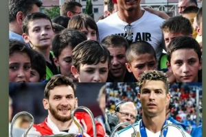 克瓦拉茨赫利亚在个人社媒晒出儿时与偶像C罗的合影,以及两人分别手捧欧冠冠军奖杯的照片。