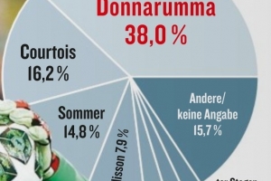 体育资讯6月2日讯 据《踢球者》报道,近期由216名德甲球员投票,选当今世界最佳门将,多纳鲁马、库尔图瓦、索默分列前三。
