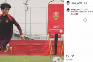 杨明洋在社媒写道:“首次入选国家队,非常荣幸能够成为其中一员。”