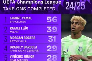 体育资讯06月02日讯 24/25赛季欧冠过人次数排名出炉,亚马尔56次的过人数让他成为本届欧冠完成过人次数最多的球员,同时,他在西甲的161次成功过人也让他成为本赛季五大联赛完成过人次数最多的球员。