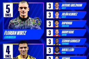 体育资讯6月2日讯 本赛季欧冠战罢,据官方统计,维尔茨是获单场最佳次数最多的球员,共计5次。