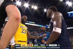 距离比赛结束还剩2分钟时,詹姆斯在一次挑战期间与对手(康利和爱德华兹)的嬉闹被媒体和球迷不断放大,此时湖人落后森林狼7分。