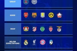 德转评估本赛季各队欧冠表现:
