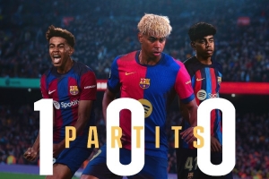 巴萨官方在社交媒体上晒出海报,向亚马尔表示祝贺。海报中为不同时期的亚马尔造型,并有100场字样。