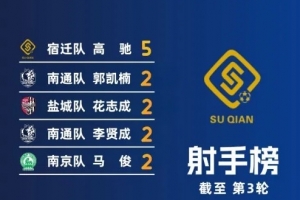射手榜方面,宿迁队高驰延续火热状态,以5粒进球继续领跑射手榜,南通队郭凯楠、盐城队花志成、南通队李贤成、南京队马俊均有2粒进球。