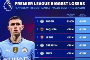 体育资讯6月3日讯 德国转会市场列出英超球员本赛季身价下滑排名,福登身价下降5000万欧最多,帕奎塔下降3700万欧次席。