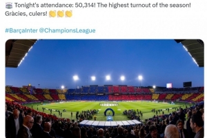 巴萨官方统计,本场比赛共有50314名球迷入场观战,创造巴萨主场本赛季观战人数最多纪录。