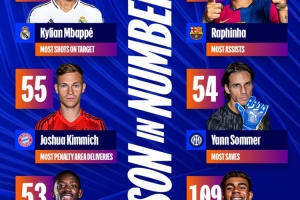 体育资讯6月3日讯 随着大巴黎问鼎大耳朵杯,2024/25赛季欧冠已落下帷幕。欧冠官方统计了球员各项数据之最,其中109次成功突破的亚马尔成为过人王,姆巴佩射中球门27次最高。