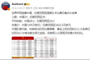 总身价:中国1205万欧元:印度尼西亚3422.5万欧元