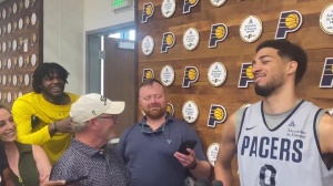 哈利伯顿接受采访,贾雷斯-沃克拄拐在一旁:“不好意思?请问你可以从Culver's帮我买两份培根芝士汉堡和薯条吗?”