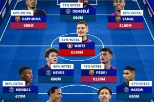 体育资讯6月4日讯 德国转会市场列出了球迷票选本赛季欧冠最佳阵容,登贝莱、亚马尔、拉菲尼亚、维尔茨在列。