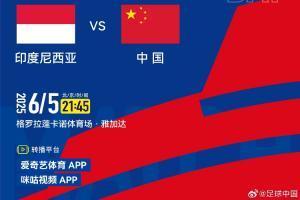 国足官方发文:北京时间6月5日21:45,国际足联2026世界杯亚洲区预选赛第九轮-中国国家男子足球队将在雅加达格罗拉蓬卡诺体育场对阵印度尼西亚国家男子足球队。锁定以下转播平台,一起为中国队加油!