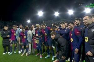 亚马尔在巴萨3-3国米的欧冠半决赛首回合比赛中迎来了里程碑,这是他在巴萨第100场比赛,他也领取了俱乐部为他准备的纪念球衣,并与队友进行合照。
