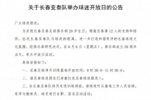 6月6日,长春亚泰足球俱乐部将迎来29岁生日。为了感谢亚泰第12人的不离不弃,俱乐部决定在生日当天举办开放日活动,邀请广大球迷和媒体朋友走进亚泰净月基地观看亚泰将士的训练。虽然这是主教练苏亚雷斯的第一堂“公开课”,但由于保级任务较重,球队只能对外开放训练课的前15分钟。