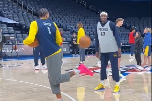 今天步行者队内训练,托平和西亚卡姆玩起了足球的颠球,两人技艺精湛引得旁人频频侧目。
