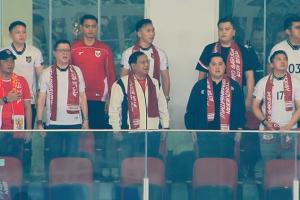 18强赛第9轮,印尼主场对阵中国男足,赛前镜头给到现场观战的印尼总统普拉博沃和印尼足协主席托希尔。
