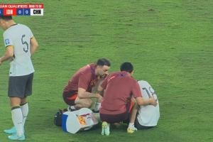 体育资讯06月05日讯 国足vs印尼上半场第25分钟,韩鹏飞蹲在场上示意受伤,队医进场治疗!