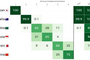 赛后数据机构Football Meets Data更新了演算预测结果,国足的晋级概率已经归零,印尼赢球后形势大好,晋级第四阶段附加赛的概率高达96%,只要巴林不胜沙特,印尼即锁定前四。
