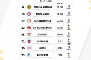 体育资讯6月6日讯 2024-25赛季的欧战赛事已全部结束,数据机构Football Rankings公布了德甲球队欧战积分排名情况,多特30.75分全欧第8,拜仁第10,勒沃库森第19。