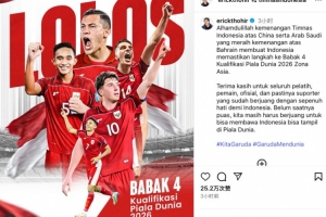印尼足协主席托希尔在社媒晒出晋级附加赛的海报,并配文写道:“印尼队坐镇主场击败中国队,同时由于本轮沙特客胜巴林,印尼队已经锁定了进入第四阶段比赛的门票。”
