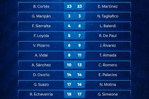 智利首发:23-科尔泰斯、3-马里潘、4-塞拉尔塔、5-洛约拉、6-维特森-皮萨罗、8-比达尔、10-桑切斯、14-奥索里奥、17-苏亚佐、18-埃切维里亚、20-卢卡斯-塞佩达